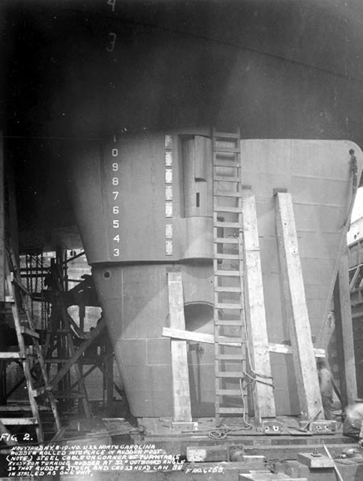 ![]() | 103k | New York Navy Yard, NY. Rudder rolled into place on rudder post. Steel cable on corner of turn table plate ready to turn rudder to 32° outboard angle so that rudder stock and crosshead may be installed as one unit, 19 August 1940. | NARA (National Archives Record Administration) photo courtesy of battleshipnc.com. | |
