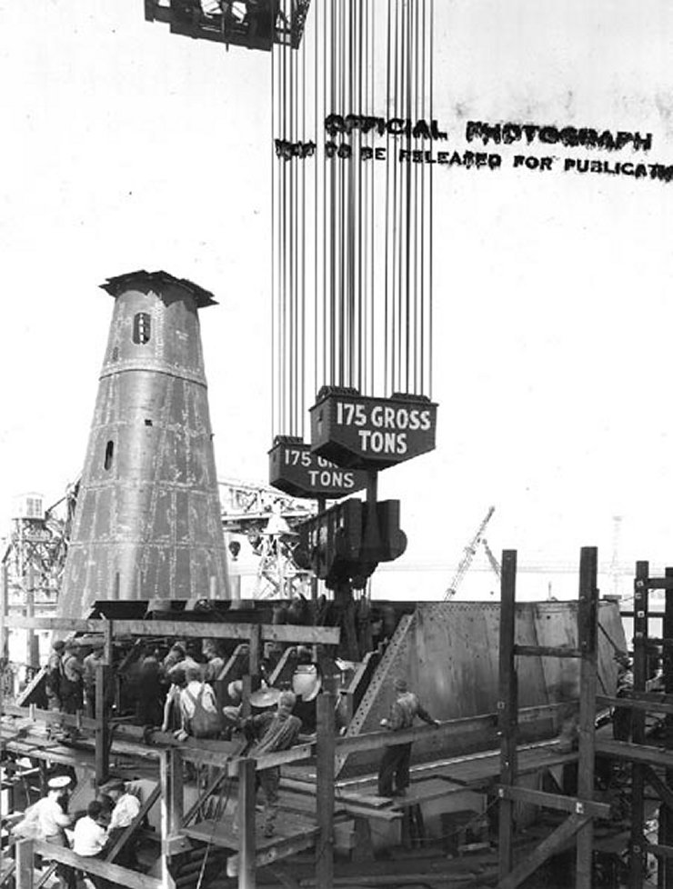 ![]() | 117k | New York Navy Yard NY. 3 gun turret, hook on ready to lift aboard by hammerhead crane, 7 September 1940. | NARA (National Archives Record Administration) photo courtesy of battleshipnc.com. | |