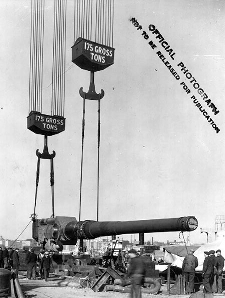 ![]() | 112k | New York Navy Yard NY. Right Hand gun being lifted off dock for Turret # 2, 9 November 1940. | NARA (National Archives Record Administration) photo courtesy of battleshipnc.com. | |