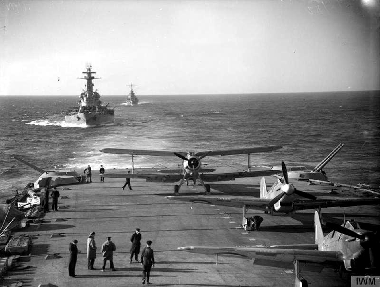 506k | On the flight deck of HMS Victorious (R 38) a Fairey Albacore is ranged for anti-submarine patrol, with two Fairey Fulmars in front. Astern are Washington (BB-56) and Wichita (CA-45) on convoy duty in the North Atlantic. | Source: Imperial War Museum Imperial Official collection by Parnall, C.H. (Lt), Photo No.IWM (A 9476) © courtesy of Mike Green. | |