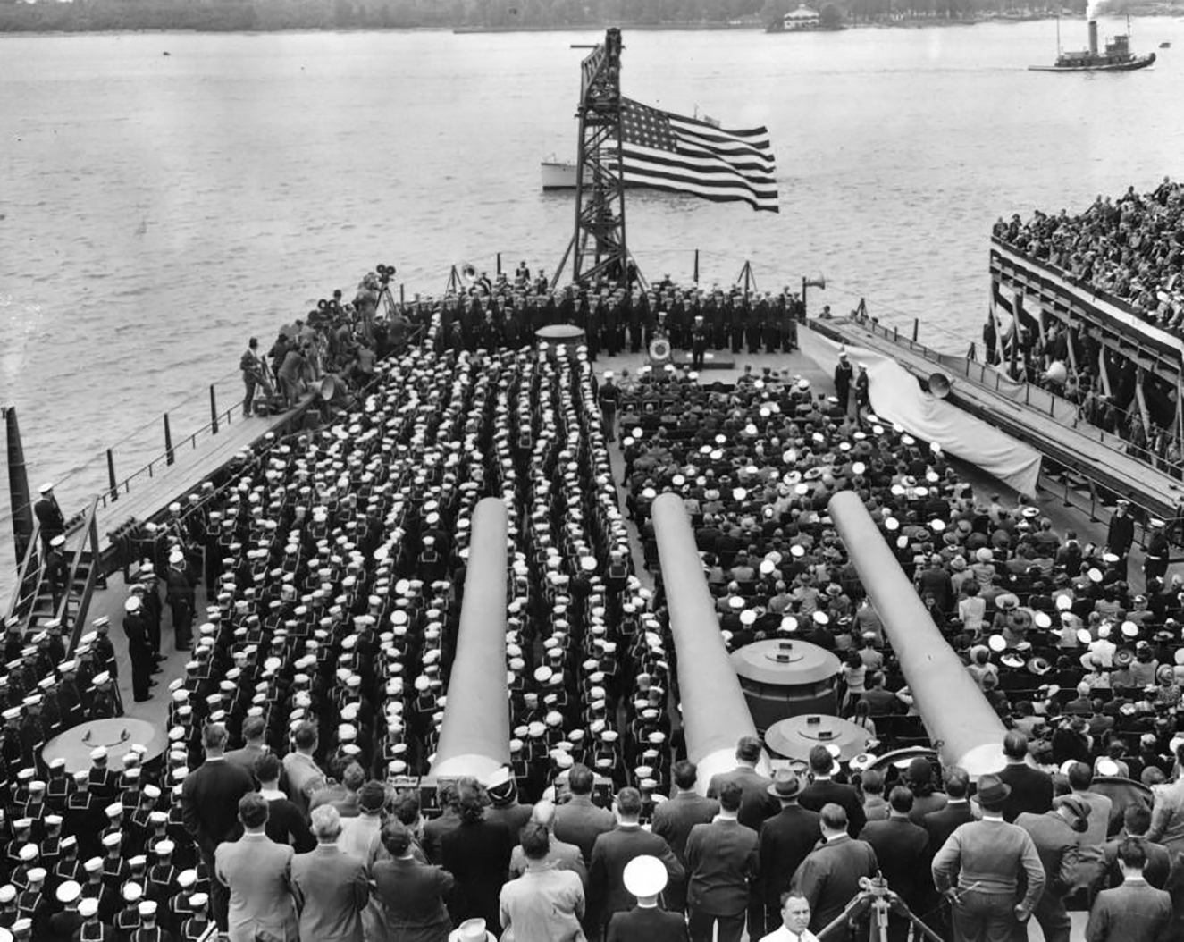 ![]() 015638c | 1.37k | NAVY TARS HEAR SECRETARY'S MESSAGE - Standing under the aft guns of the battleship Washington (BB-56) at her commissioning today, officers and men of the crew heard Navy Secretary Frank Knox declare: "It is a marvelous thing to be called to duty on one of the two greatest battleships plying the ocean, both of them flying the flag of the United States." | Photo by Hulton Archive/Getty Images, courtesy of gettyimages.com. | |