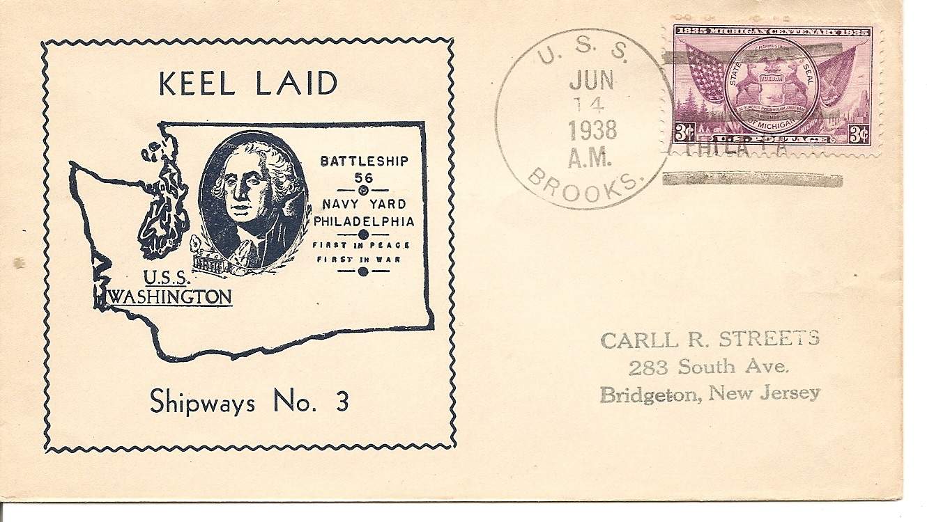 136k | Commemorative postal cover marking the keel laying of the Washington (BB-56), 14 June 1938. | Photo courtesy of Tommy Trampp. | |