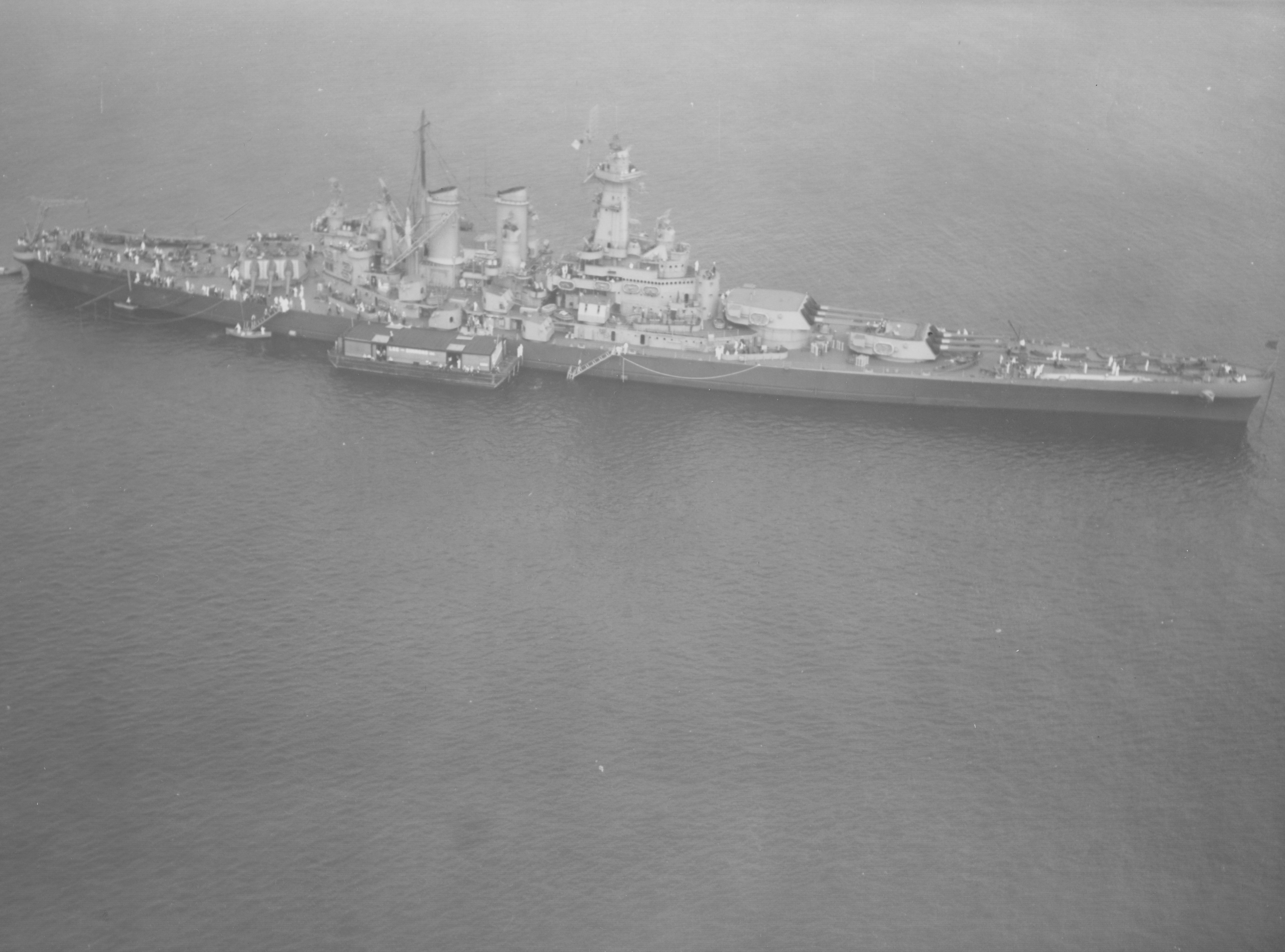 ![]() | 112k | Bayonne Naval Supply Depot, New Jersey. Photographed on 15 April 1953 with ships in reserve. The two large ships at right on the near side of the peninsula are Alaska (CB-1) and Guam (CB-2). The next two ships astern are North Carolina (BB-55) and Washington (BB-56). Further astern are (from outboard to inboard) Fargo (CL-106), Albemarle (AV-5) and Wakefield (AP-21). The carriers Enterprise (CV-6) and Franklin (CV-13) are at the far left. Also present are the escort carriers Card (CVE-11), Croatan (CVE-25), Mission Bay (CVE-59), and Guadalcanal (CVE-60) along with the cruisers Providence (CL-82), Little Rock (CL-92), Spokane (CLAA-120) and Fresno (CLAA-121). One of the two CLAAs is tied up outboard of the Alaskas'. | Official USN photo Naval History and Heritage Command # 80-G-480262, now in the collections of the National Archives. | |