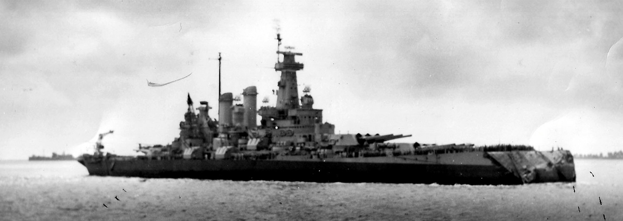 83k | Washington (BB-56) underway with a collapsed bow, after colliding with Indiana (BB-58) during the Marshalls Operation, 1 February 1944. | U.S. Naval Historical Center Photograph # NH 68353. | |