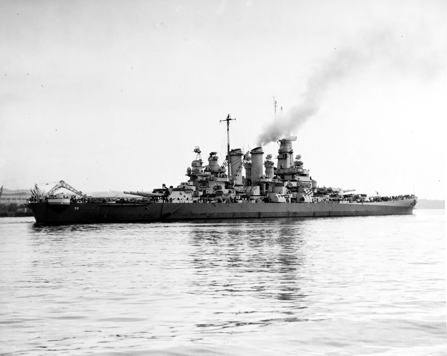 431k | Washington (BB-56) anchored off Puget Sound, Navy Yard, 10 September 1945 after completing her final refit. When she completed her post-repair trials and conducted underway training out of San Pedro, Calif., she headed for the Panama Canal, returning to, the Atlantic Ocean. Joining TG 11.6 on 6 October 1945. | Source: United States National Archives, Photo No. 19-N-89067 via Mike Green. | |
