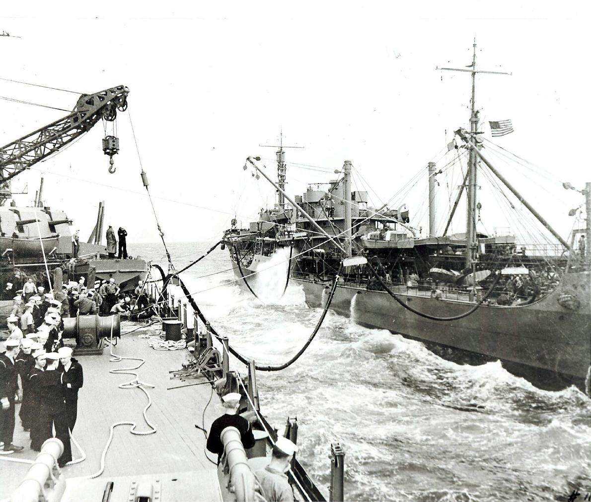 174k | Looking forward from the stern area of Washington (BB-56) while refueling from Salamonie (AO-26). Notice the starboard boat crane being used to secure the oil hoses and the forward 5"/38 twin mounts with their barrels pointing at an elevated angle during this refueling. |