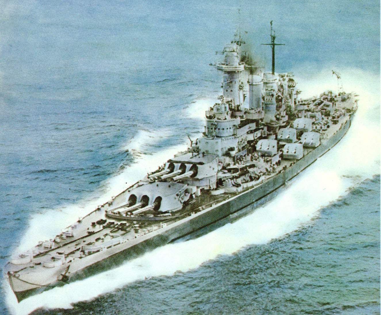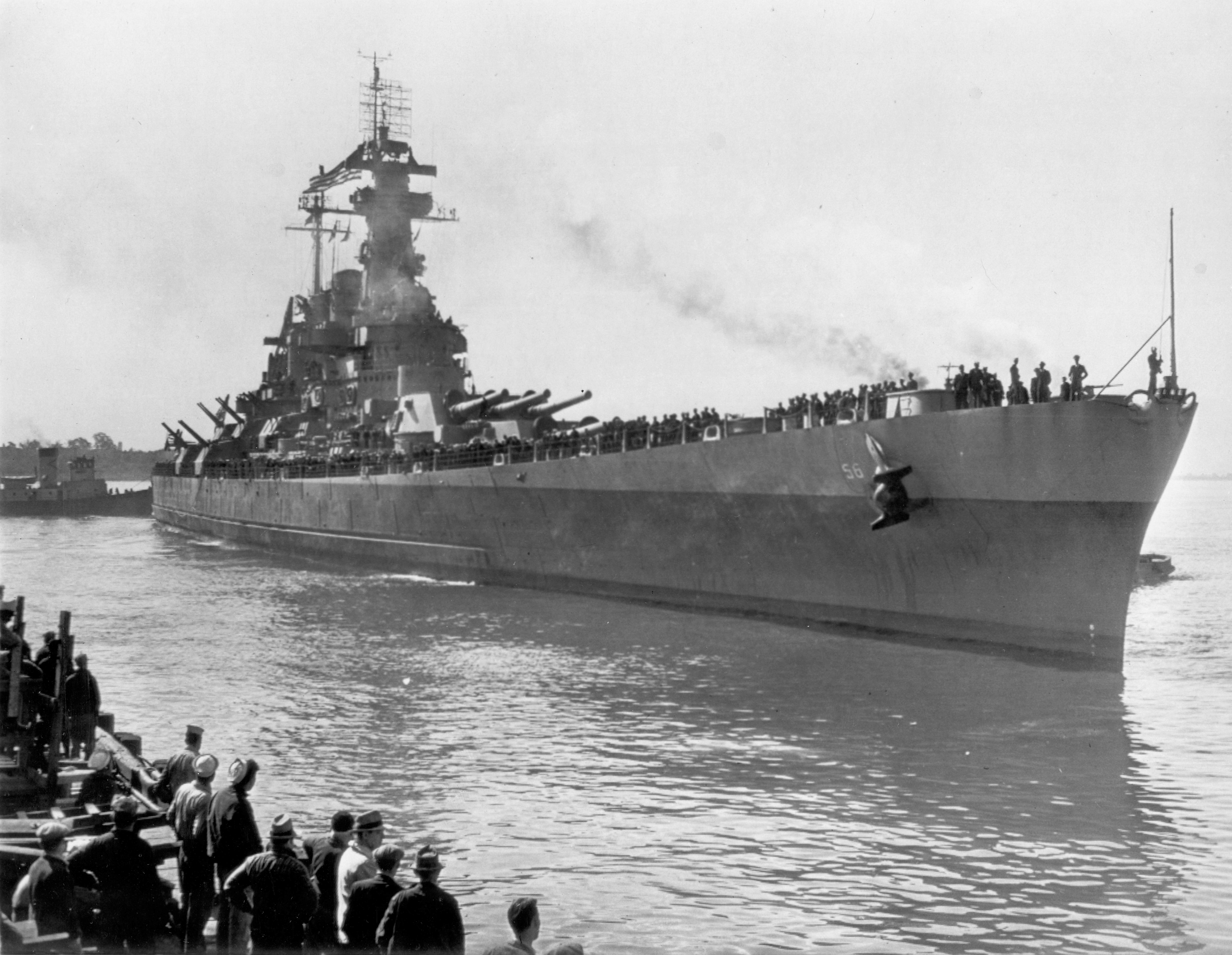 116k | Washington (BB-56) entering Philadelphia on October, 1945 to celebrate Navy Day at her birthplace. The close up shot shows good detail of her A.A. batteries, radars and general ship layout in her final wartime appearance. | USN photo. | |