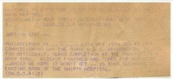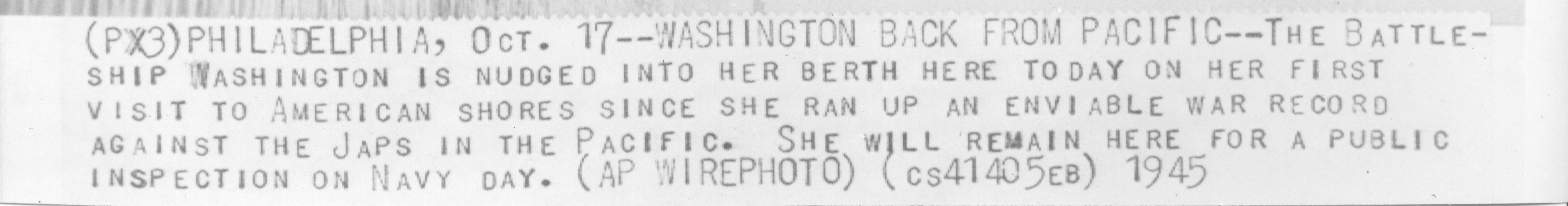 1.91k | 17 October 1945:WASHINGTON (BB-56) BACK FROM PACIFIC | A .P. Wirephoto courtesy of Pieter Bakkels. | |