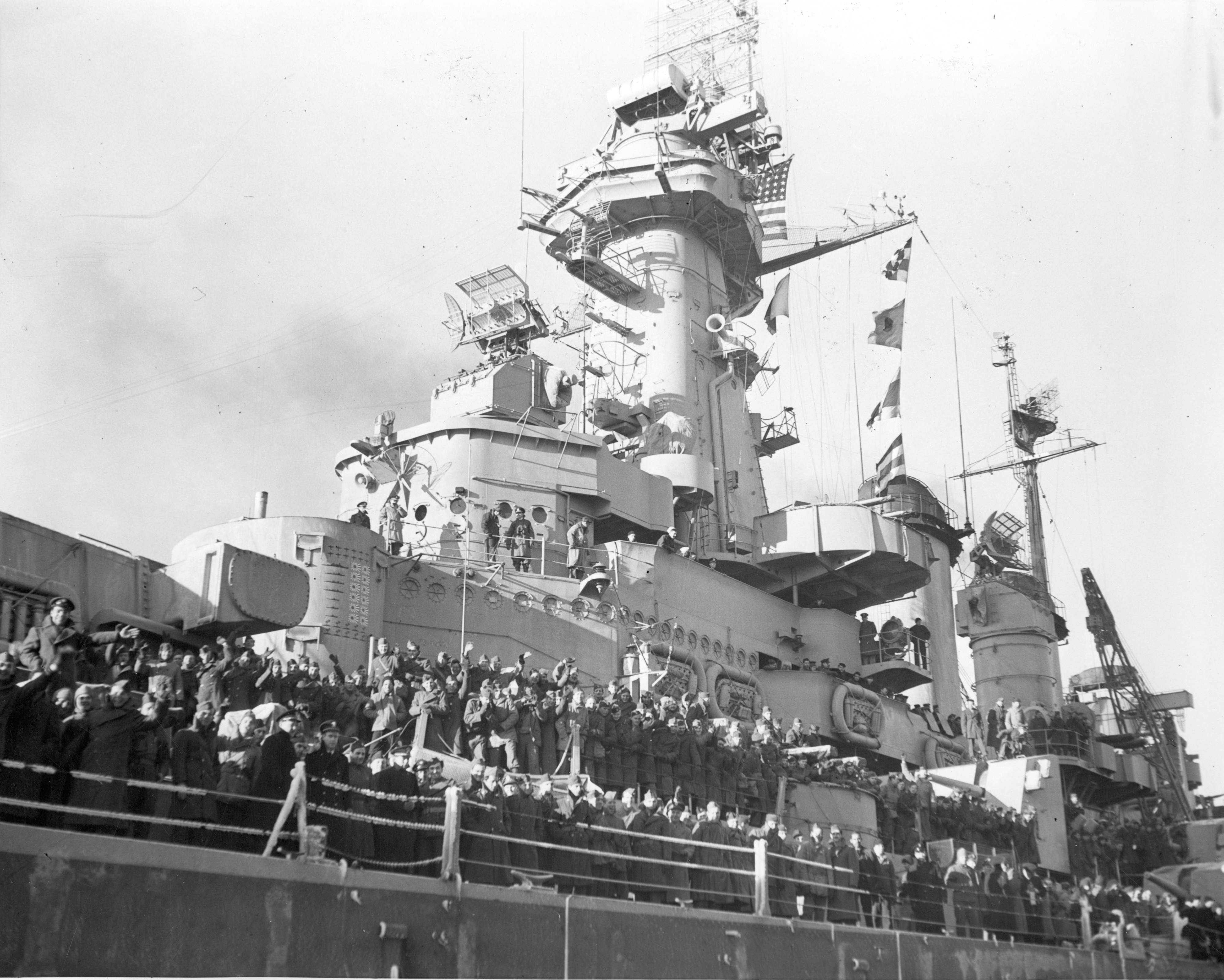 789k | BATTLEWAGON IN WITH STORM TOSSED GI'S. THE BATTLESHIP WASHINGTON (BB-56) IS SHOWN AS SHE ARRIVED IN NEW YORK THIS MORNING WITH HUNDREDS OF SERVICEMEN FROM THE EUROPEAN THEATRE JUST GETTING UNDER THE WIRE TO PERMIT THE WARRIORS TO SPEND CHRISTMAS IN THE UNITED STATES. THE HAPPY GI'S LINE THE RAIL OF THE BATTLEWAGON WHICH TOOK A POUNDING FROM A 75 MILE AN HOUR GALE DURING THE CROSSING. |