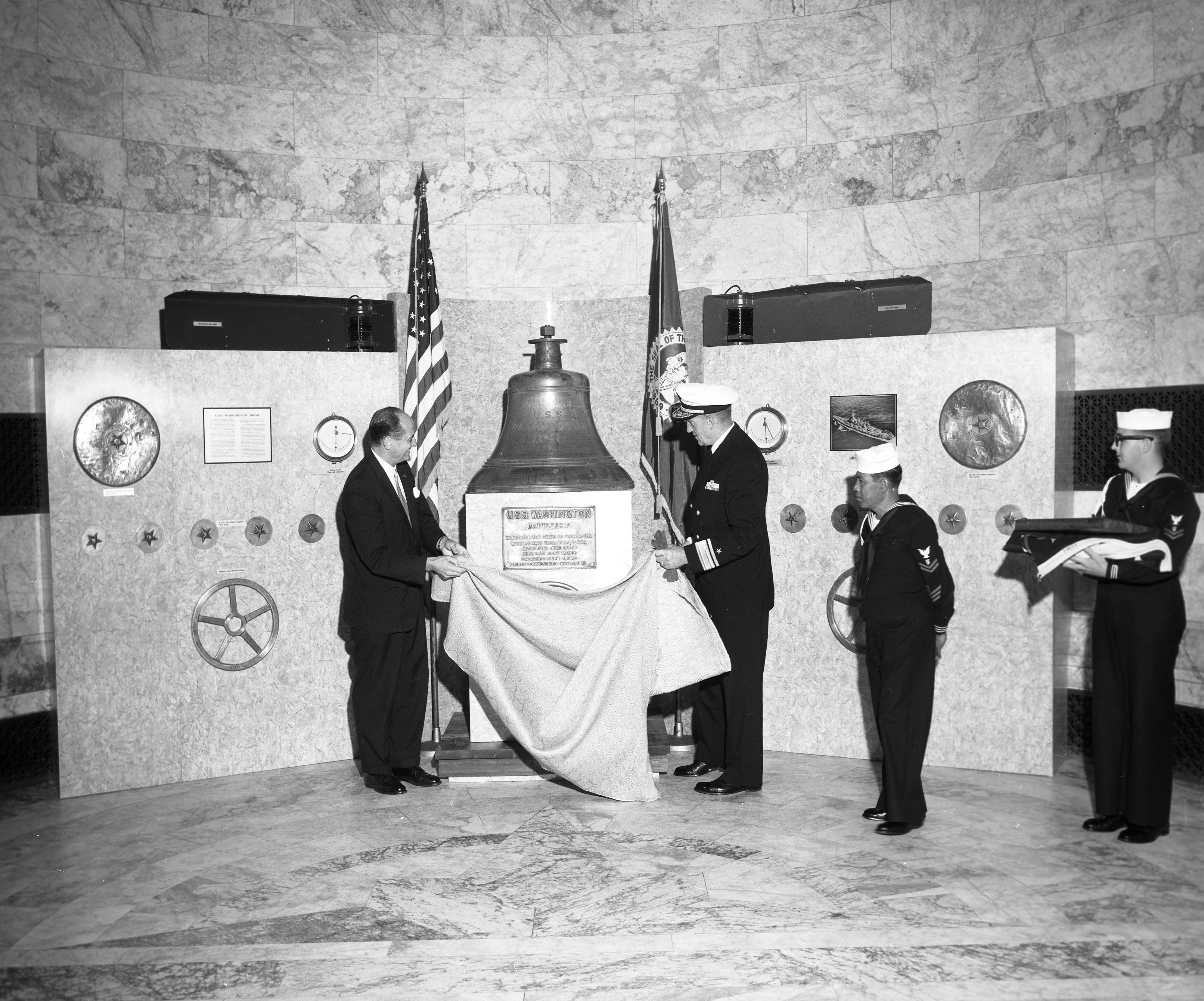 1.63k | Washington (BB-56) items were contributed to the State of Washington and were placed on display in the foyer of the Legislative Building in 1962. Items on display were the port and starboard running lights, throttle wheels, inclinometers, 5" and 16" gun tampions, a photo of Washington, the ship's bell, and the ship's wheel. The picture shows then-Governor Albert Rosellini unveiling the display with Navy personnel in 1962. | Rosellini with Washington display, 1962, photographer unknown, State Governors' Negative Collection, 1945-1975, Washington State Archives, Digital Archives courtesy of Bryan D. Fisher, RMC, USCG. | |