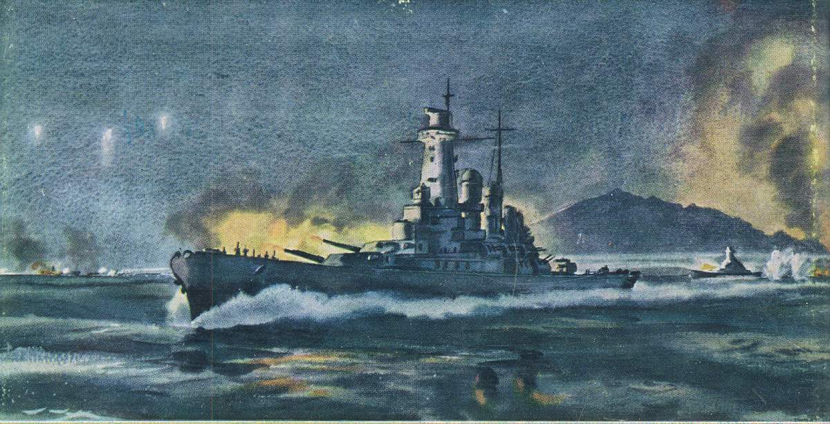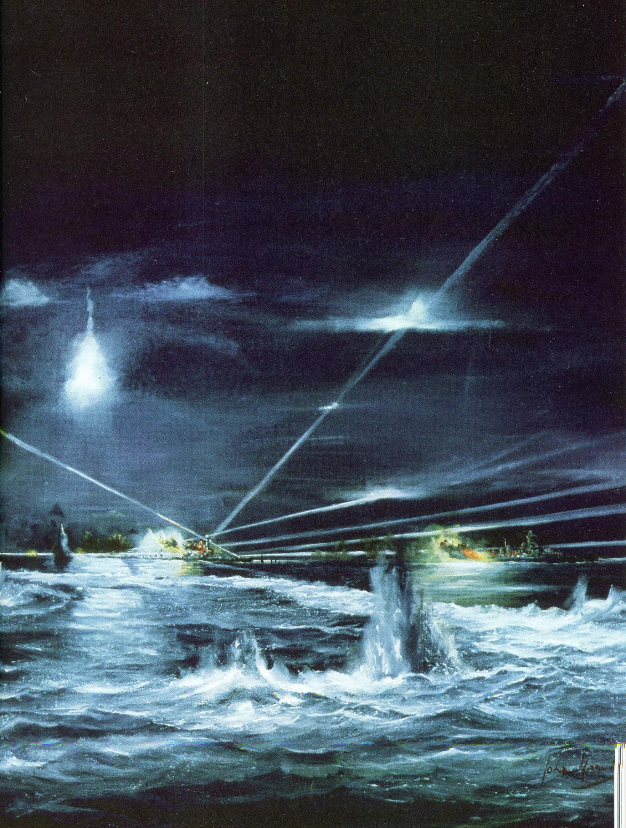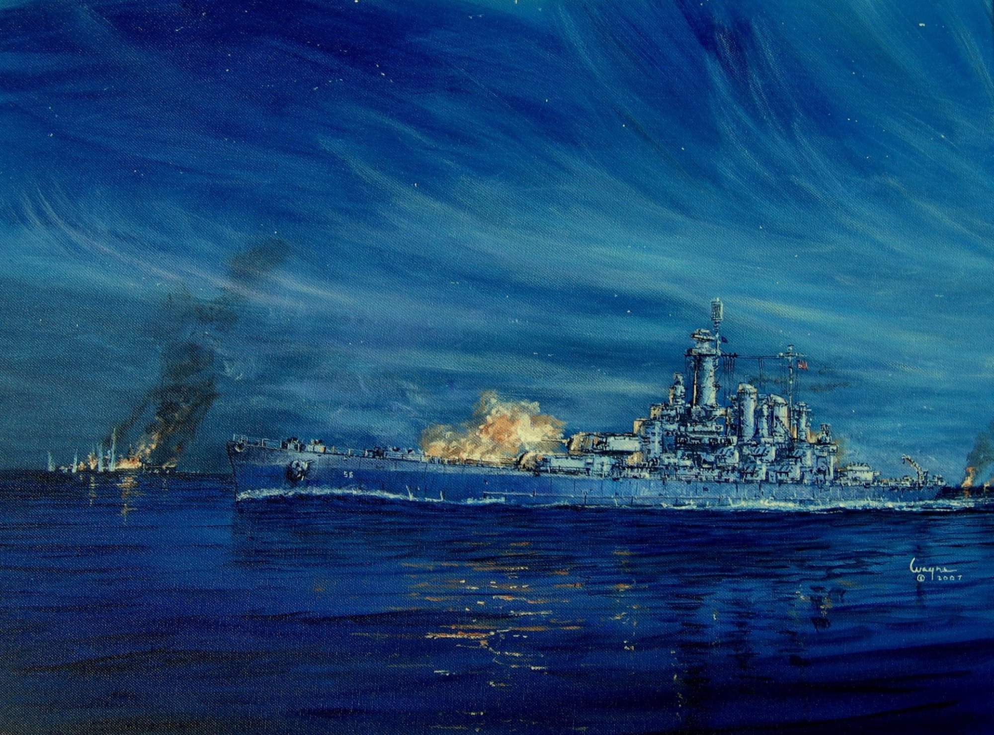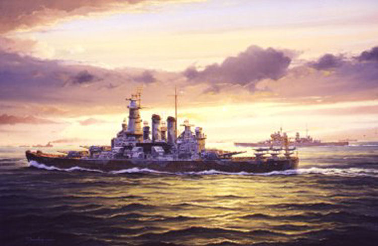 35k | Oil on canvas painting by the artist Anthony Saunders, entitled "Arctic guardian - Washington". In the Spring of 1942, Washington (BB-56) was the first of America's fast battleship fleet to participate in combat operations when she was briefly assigned to the Royal Navy. On the 28th June 1942, together with HMS Duke of York, HMS Victorious and an accompanying cruiser and destroyer force, she formed part of the distant covering force to convoy PQ-17 bound for Russia. |