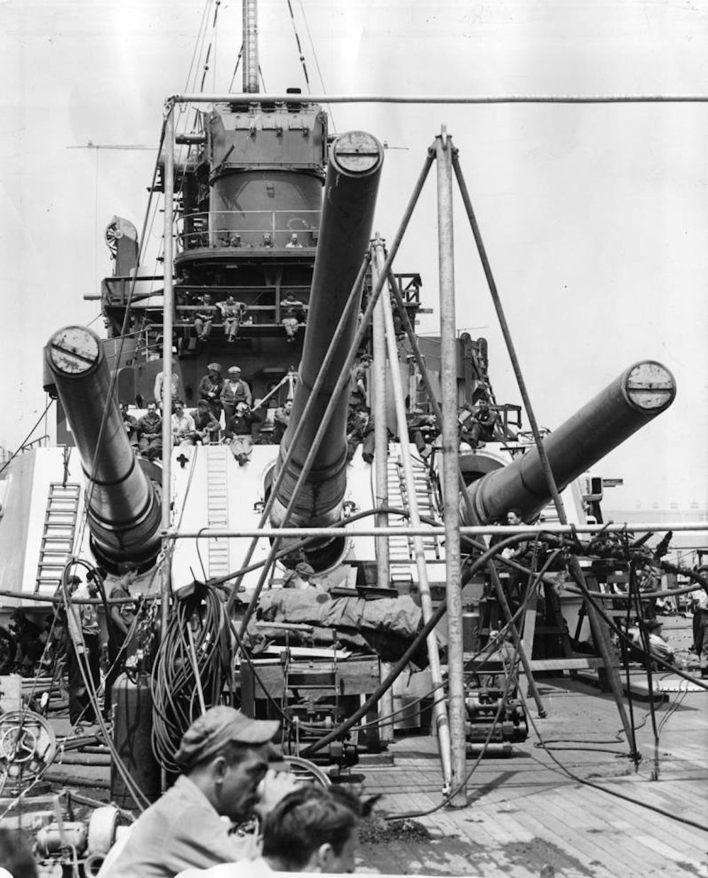 ![]() 015633 | 640k | Construction workers enjoy a lunch break aboard the Washington (BB-56), 1941. | Photo courtesy of the George D. McDowell Philadelphia Evening Bulletin Photographs @ digital.library.temple.edu | |
