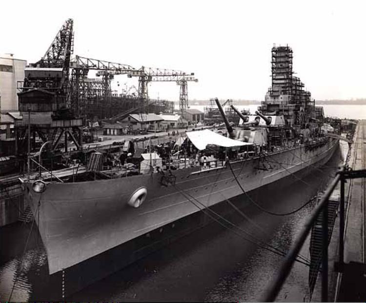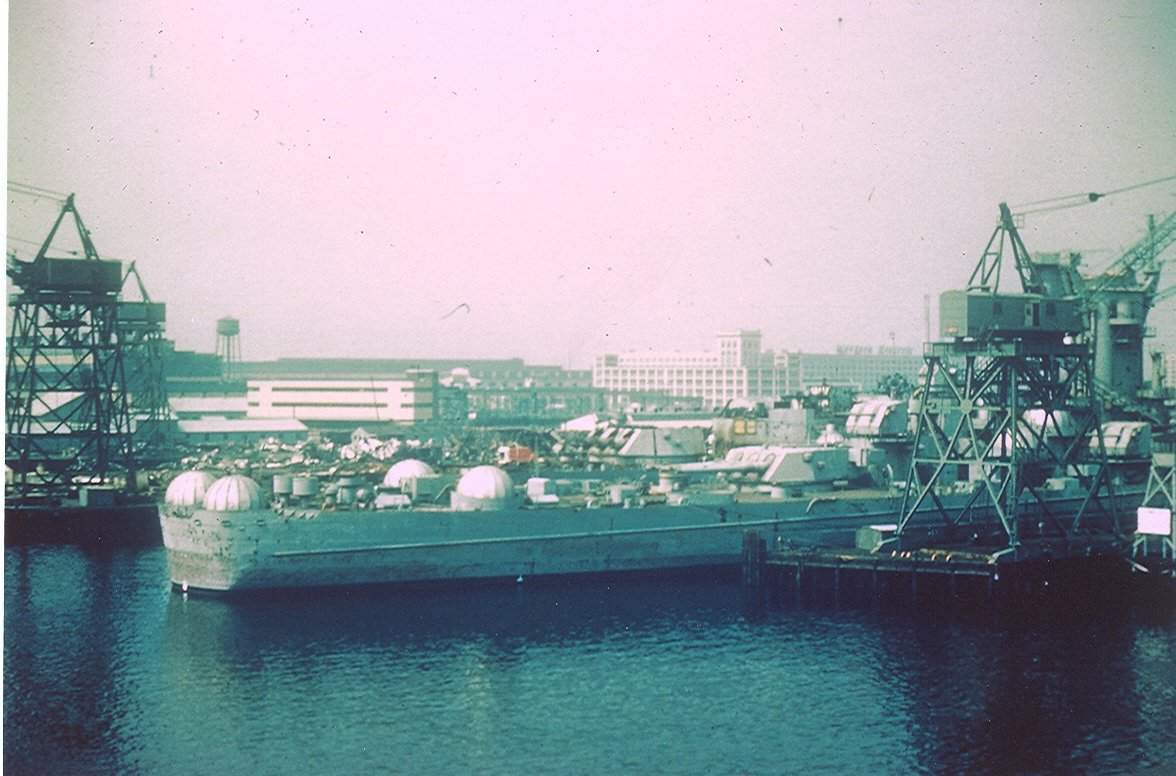 1.46k | Washington (BB-56) at Pearl Harbor Navy Yard fitted with temporary bow on 4 March 1944. The dock is being flooded, as the Washington prepares to sail to Puget Sound Naval Shipyard, where the ship will be repaired, along with a refit and upgrades. | Source: United States National Archives, Photo No. ARC 512915 via Mike Green. | |
