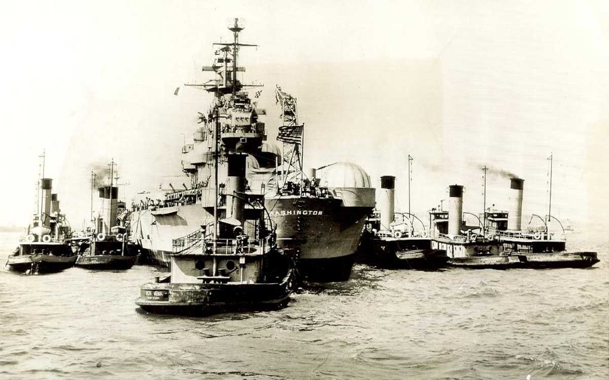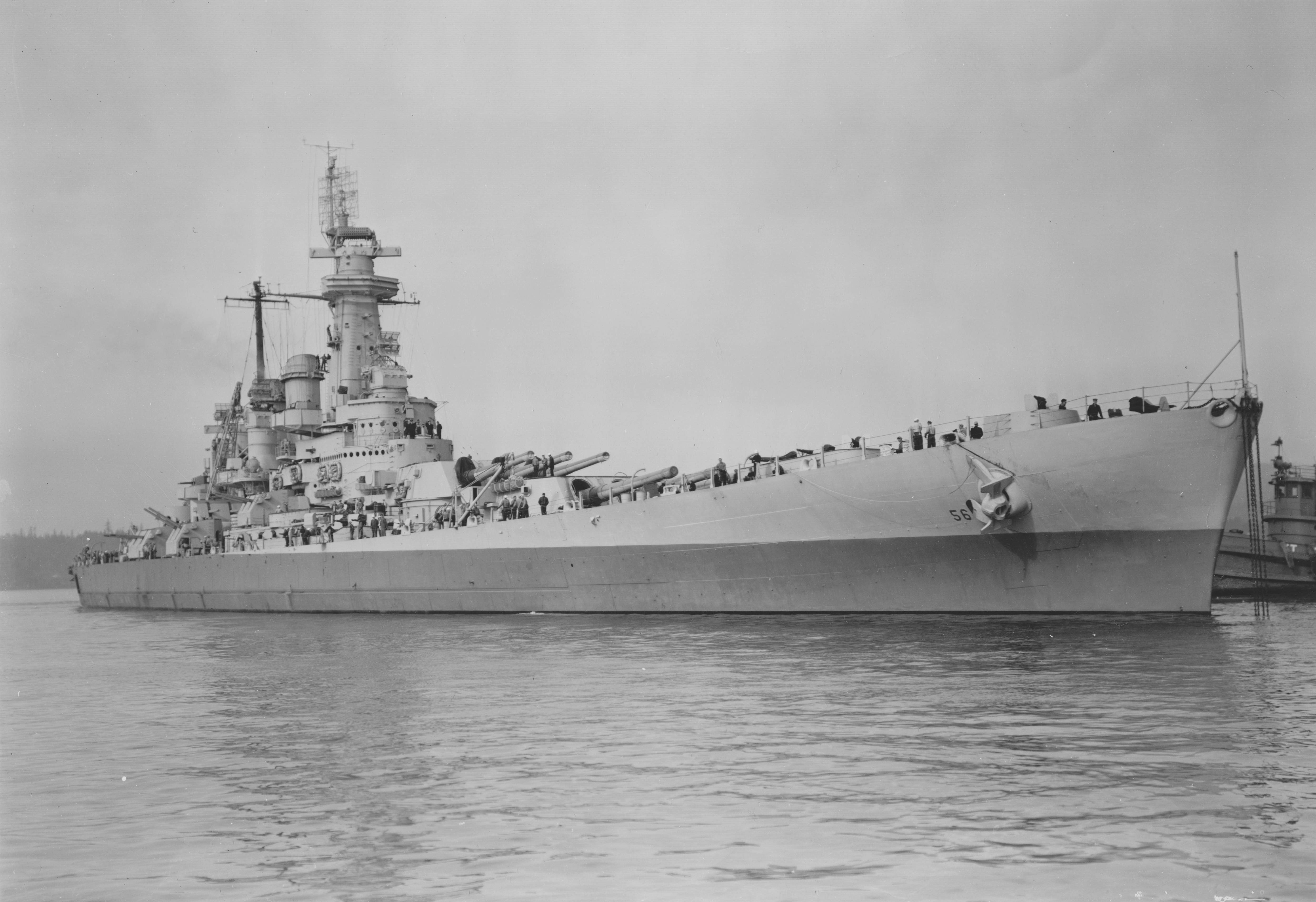 1.33k | Washington (BB-56) being assisted by tugs after her launching. | Department of the Navy. Bureau of Aeronautics. Naval Aircraft Factory, Philadelphia, Pennsylvania. Image from the National Archives and Records Administration. Still Picture Records Section, Special Media Archives Services Division. ARC Identifier 518859, courtesy of Robert Hurst. |