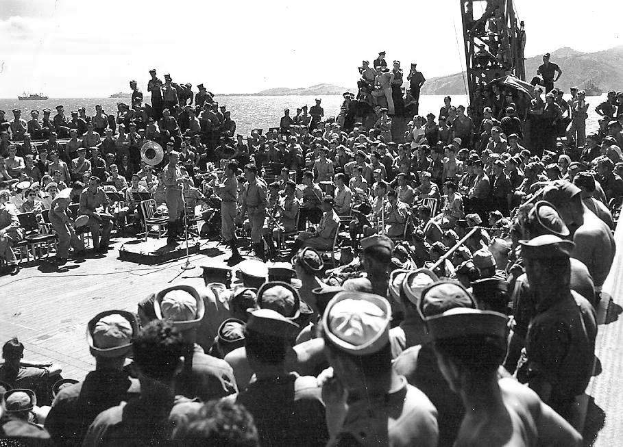 132k | Washington's (BB-56) crew assembled for comedian Joe E. Brown performing on the ship's fan tail on 15 February 1943 in Dumbea Bay, Noumea, New Caledonia. Performed the same day, after Halsey awarded the Navy Cross to RADM Lee. From wikipedia World War II In 1939, Brown testified before the House Immigration Committee in support of a bill that would allow 20,000 German-Jewish refugee children into the U.S. He later adopted two refugee children. At age 50 when the U.S. entered World War II, Brown was too old to enlist. Both of his biological sons served in the military during the war. In 1942, Captain Don E. Brown was killed when his Douglas A-20 Havoc crashed near Palm Springs, California. Even before the USO was organized, Brown spent a great deal of time traveling, at his own expense, to entertain troops in the South Pacific, including Guadalcanal, New Zealand, and Australia, as well as the Caribbean and Alaska. He was the first to tour in this way, before Bob Hope made similar journeys. Brown also spent many nights working and meeting servicemen at the Hollywood Canteen. He wrote of his experiences entertaining the troops in his book Your Kids and Mine. On his return to the U.S., Brown brought sacks of letters, making sure they were delivered by the Post Office. He gave shows in all weather conditions, many in hospitals, sometimes doing his entire show for a single dying soldier. He signed autographs for everyone. For his services to morale, Brown became one of only two civilians to be awarded the Bronze Star during World War II. |
