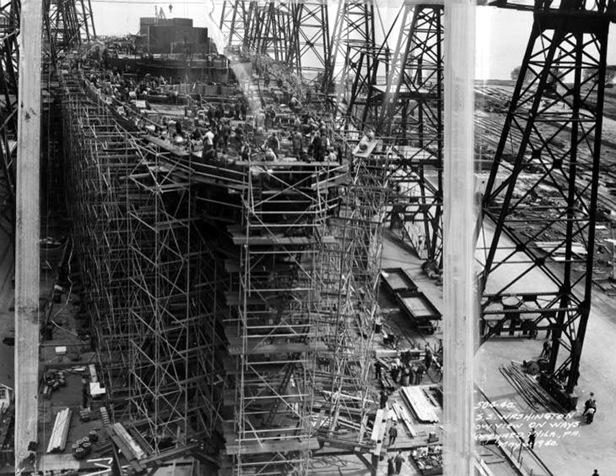465k | Washington (BB-56) at the Philadelphia Navy Yard, on 15 May 1940 being made for launching. The ship will be launched on 1 June. | Photo courtesy of the George D. McDowell Philadelphia Evening Bulletin Photographs @ digital.library.temple.edu via Mike Green. | |