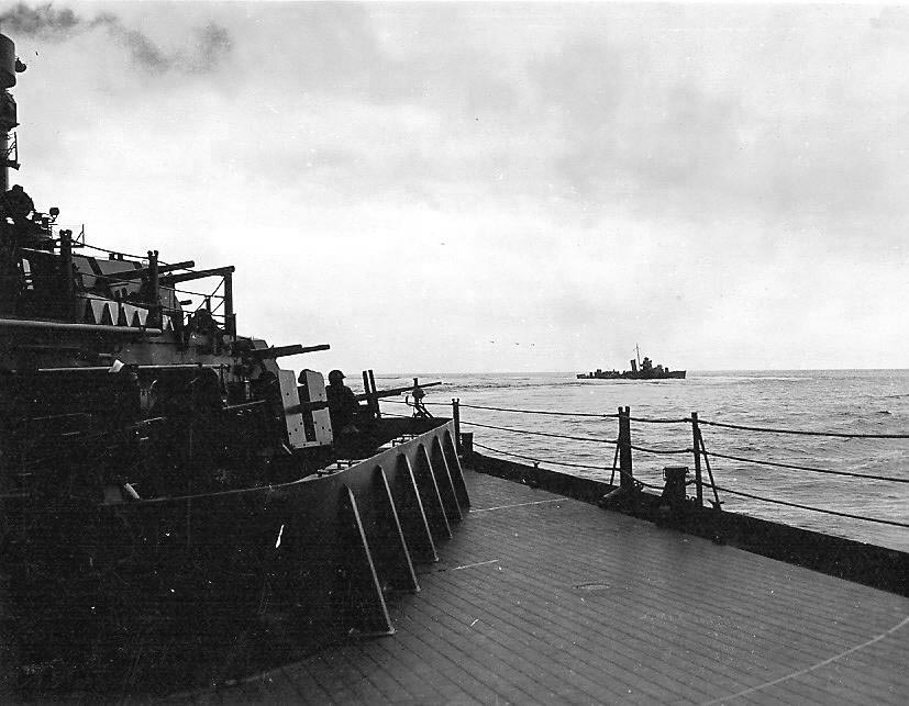 97k | 1942 photo of an unidentified escorting destroyer, as seen from the Washington (BB-56) port main deck. 5"/38 twin mounts and manned 20mm light A.A. guns are visible. | USN photo courtesy of Mike Green. | |