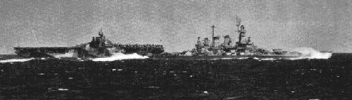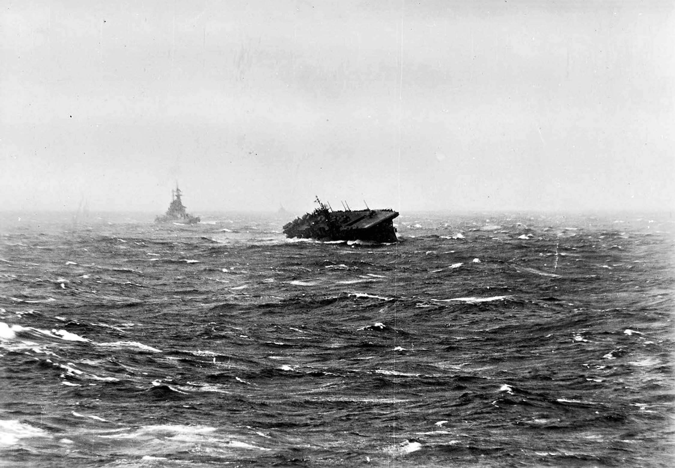 321k | As seen from the Essex (CV-9), the Langley (CVL-27) with the Washington (BB-56) astern plowing through heavy seas on 13 January 1945 in the South China Sea. The stability differences of light carriers versus battleships is clearly evident. | Photo courtesy of US Navy and Marine Corps Museum/Naval Aviation Museum, Photo No. 1983.046.010.098 via Mike Green. | |