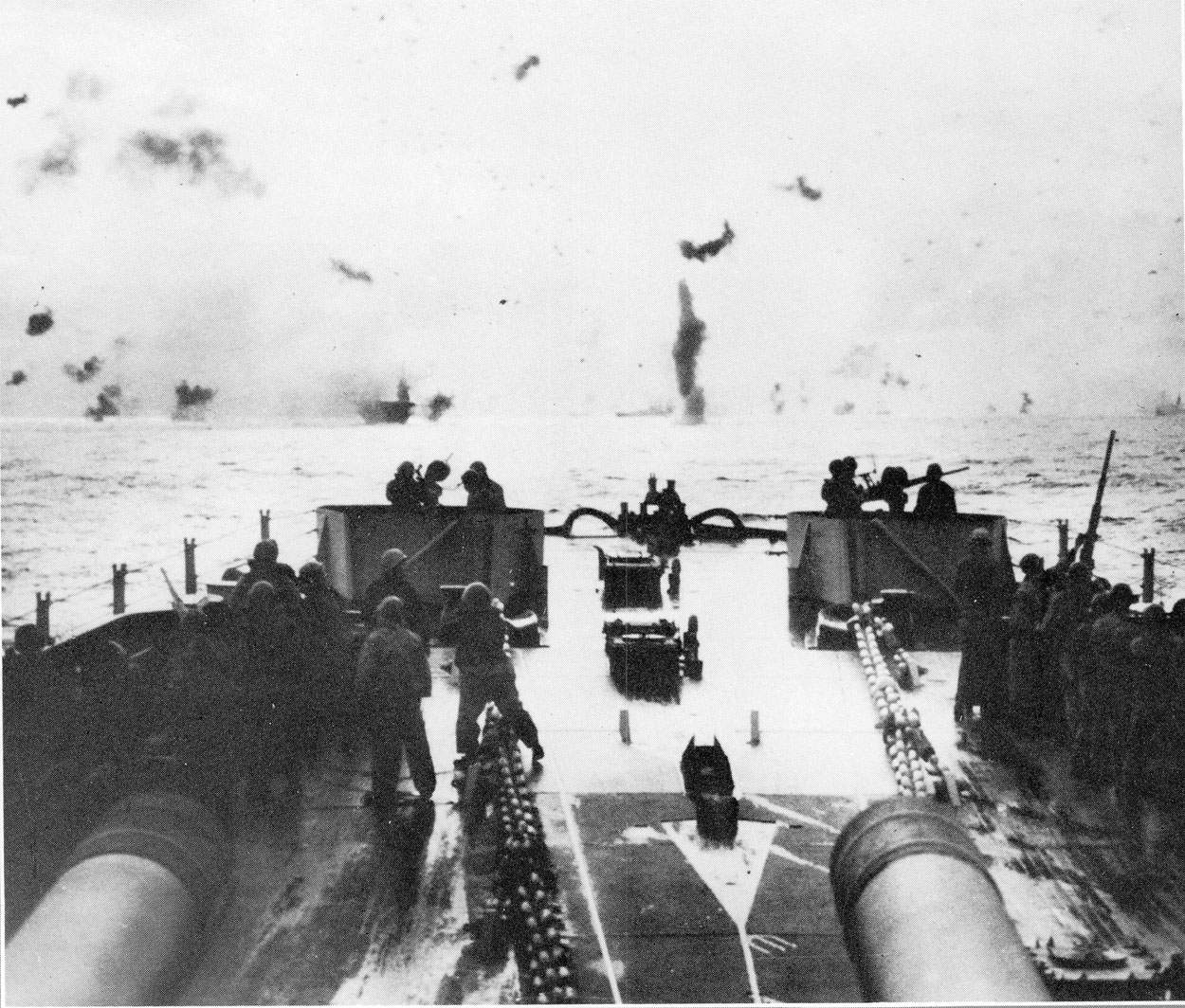 ![]() | 231k | A view of the action over the bow during the Gilbert Islands Operation. Note the bow 20mm guns and crew in ready position and also the carrier steaming ahead. December, 1943. | USN photo by Capt. Herbert Campbell, courtesy of Pieter Bakels. | |