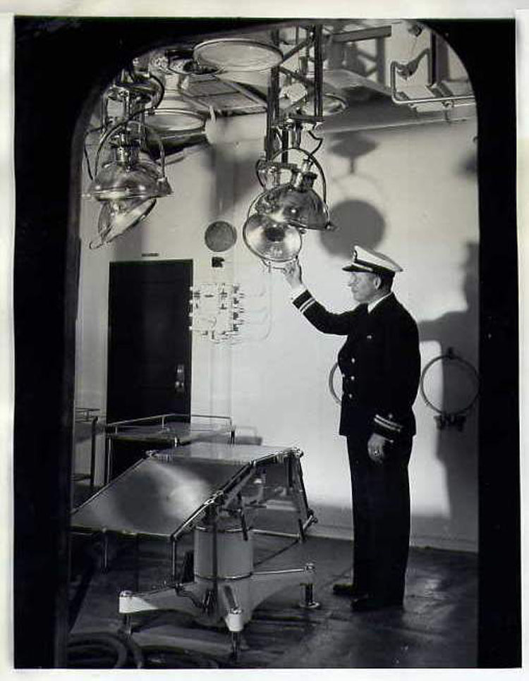 123k | 3 May 1941: JUST IN CASE; With 15 May set as commissioning day the giant Washington's (BB-56), 35,000 ton battleship nears completion at the Philadelphia Navy Yard. Already finished and open for business, which we hope it won't get, is the Operating Room of the ship's hospital. | A. P. Wire Photo courtesy of San Francisco Examiner via David S. Smith & Tommy Trampp. | |