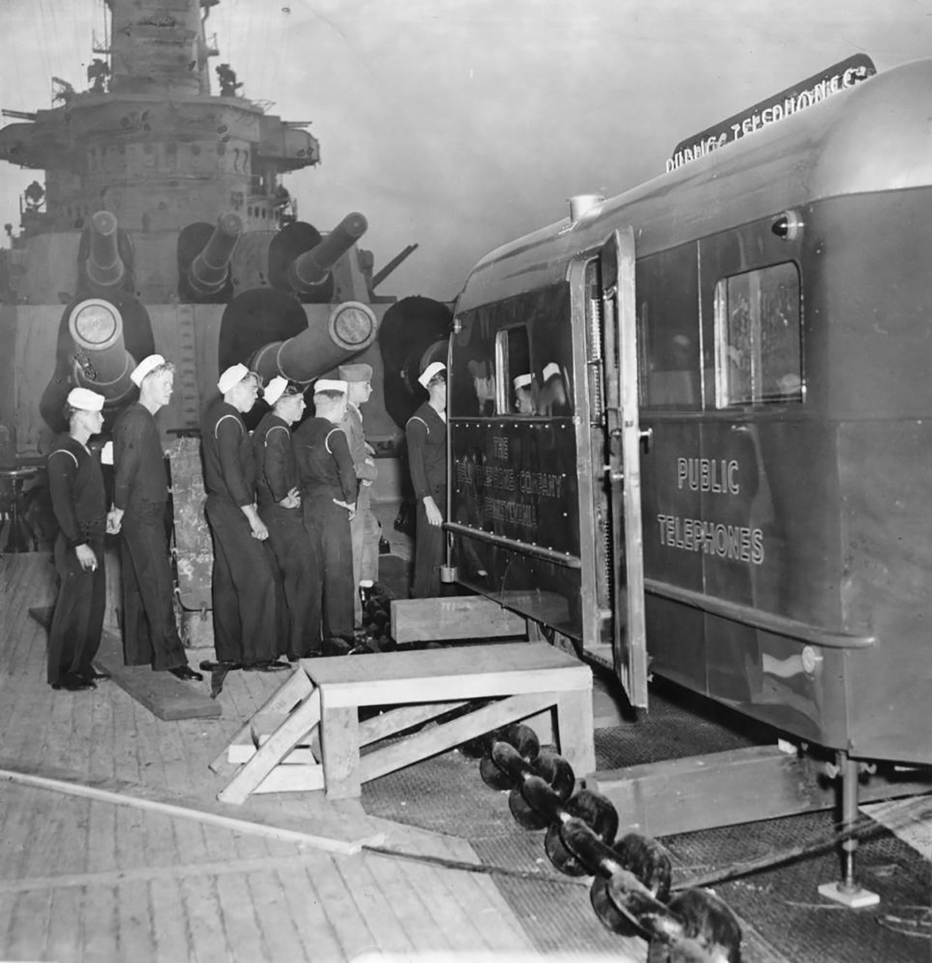 556k | "Telephone service for Washington (BB-56) crew", 19 October 1945. "Sailors line up to take their turns at the telephone booths in a trailer placed on the forecastle of the giant battleship yesterday." |