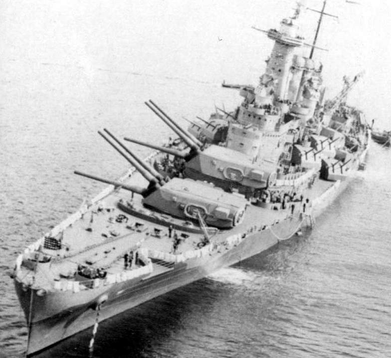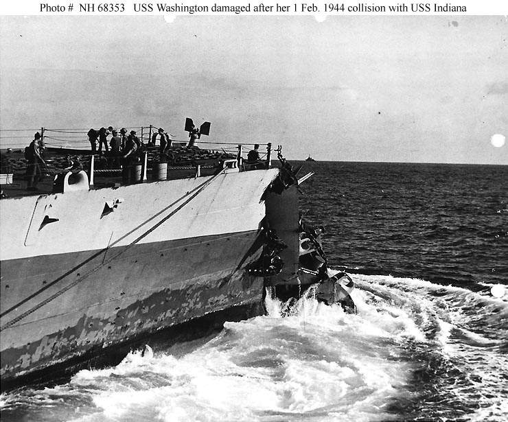 759k | Washington (BB-56) in Majuro Atoll, Kwajalein after ramming the Indiana (BB-58). | Photo courtesy of curator@battleshipnc.com website; Source: United States Navy, photo via Mike Green. | |
