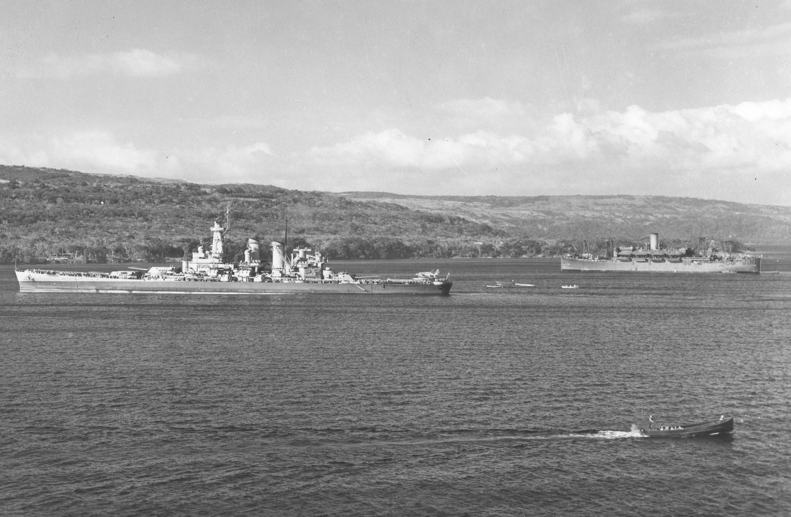 455k | TG 38.3 enters Ulithi anchorage in column, 12 December 1944 while returning from strikes on targets in the Philippines. Ships are (from front): Langley (CVL-27); Ticonderoga (CV-14); Washington (BB-56); North Carolina (BB-55); South Dakota (BB-57); Santa Fe (CL-60); Biloxi (CL-80); Mobile (CL-63) and Oakland (CL-95). | None of these can be 12 December. These ships (TG 38.3) departed Ulithi on 11 December. This TG entered Ulithi together on 2 and 24 December. These are likely 24 December 1944 when they're conducting numerous maneuvers and firing exercises while entering Ulithi. Slight chance 2 December but if Oakland (CL-95) is in the picture, she didn't enter with the others on 2 December. One thing for certain, these are not the 11th like the caption on NHHC states. Many open discussions on forums discussing the merits of both dates. Text & ID courtesy of Richard Averitt. Official USN photo # 80-G-301351 & HN-SD-97-00850 now in the collections of the National Archives. Photo from the Department of Defense Still Media Collection, courtesy of dodmedia.osd.mil. | |