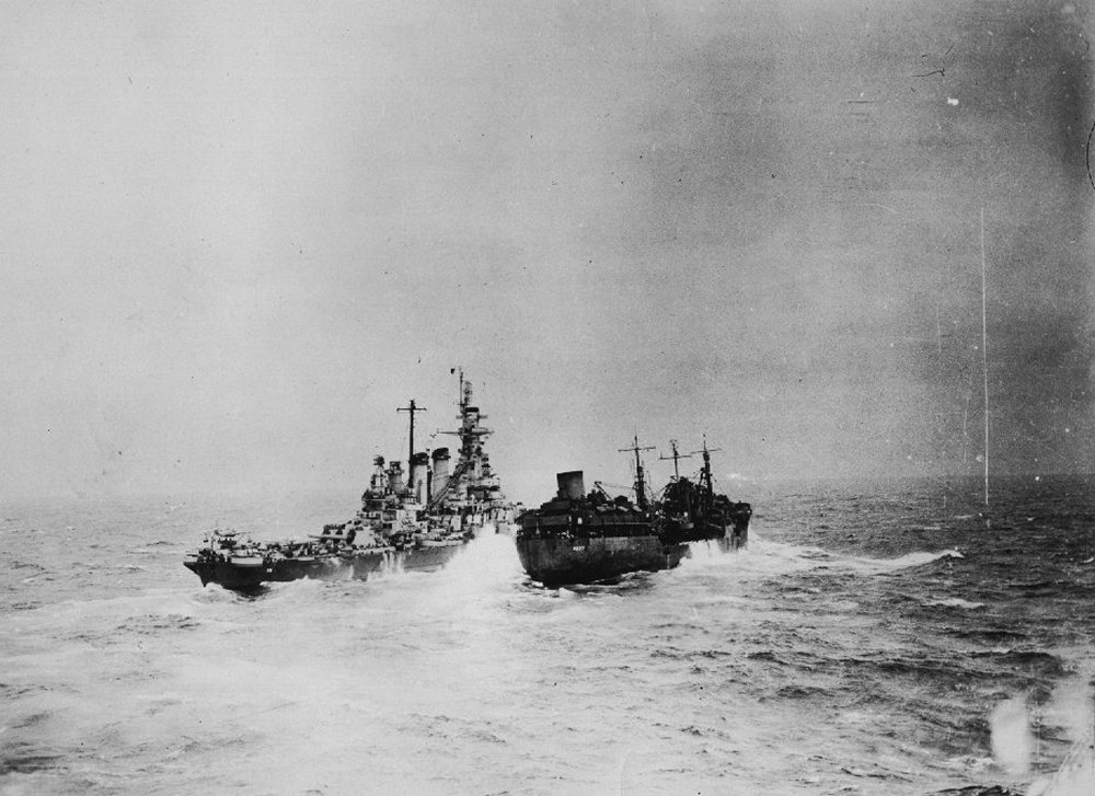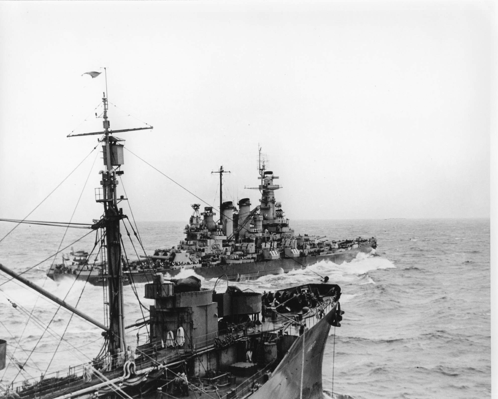 205k | Washington (BB-56) clearing the T3-S2-A1 tanker Kaskaskia (AO-27) off Okinawa, April 1945. | USN photo courtesy of Pieter Bakels. | |