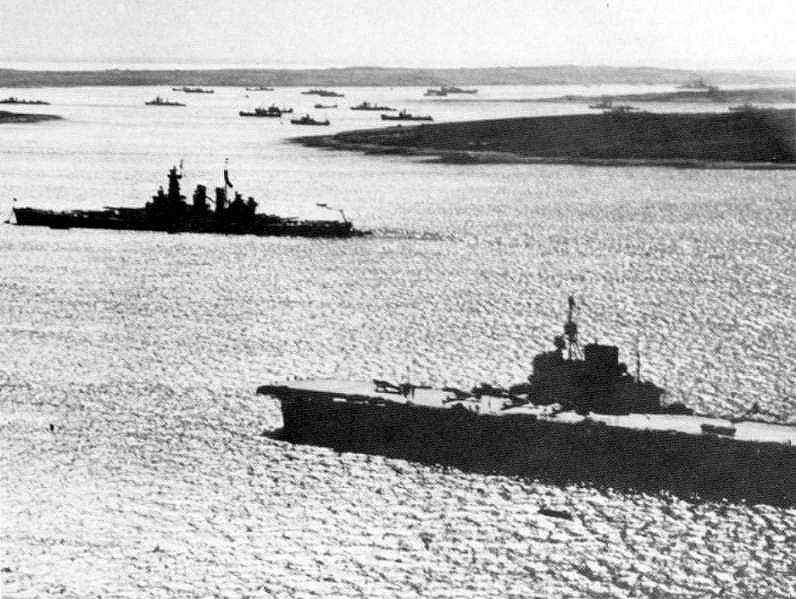 575k | TG 38.3 entering Ulithi on 12 December 1944, taken by Essex (CV-9), & showing the Ticonderoga (CV-14); Washington (BB-56); North Carolina (BB-55); and South Dakota (BB-57). | Text & ID courtesy of Richard Averitt. None of these can be 12 December. These ships (TG 38.3) departed Ulithi on 11 December. This TG entered Ulithi together on 2 and 24 December. These are likely 24 December 1944 when they're conducting numerous maneuvers and firing exercises while entering Ulithi. Slight chance 2 December but if Oakland (CL-95) is in the picture, she didn't enter with the others on 2 December. One thing for certain, these are not the 11th like the caption on NHHC states. Many open discussions on forums discussing the merits of both dates. Text & ID courtesy of Richard Averitt. USN photo courtesy of Pieter Bakels. |