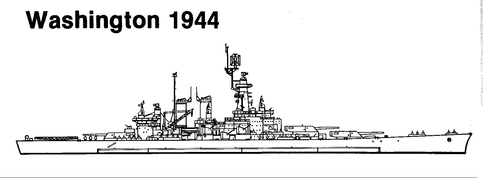 72k | Line art drawing of the Washington (BB-56), 1944. | Contributed by Joseph M. Radigan (of blessed memory). | |