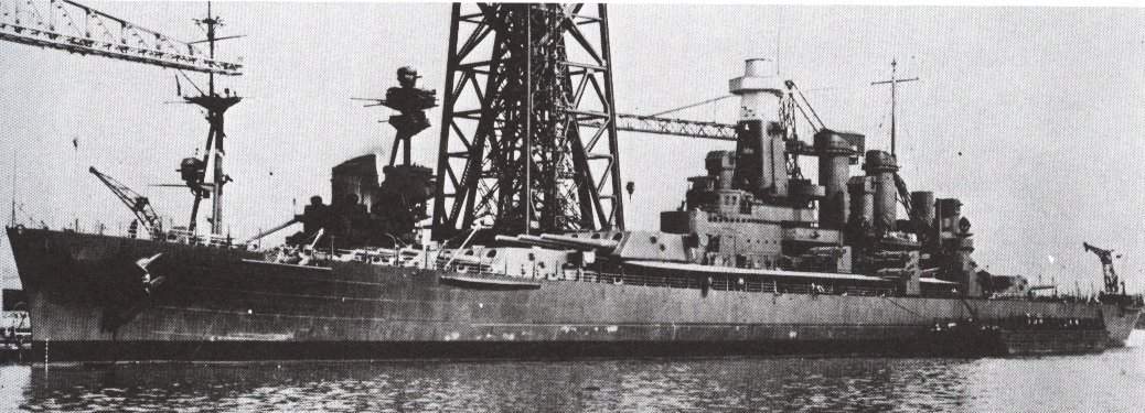 96k | August, 1942 photo just before leaving the East coast for the Pacific. A Kingfisher seaplane is visible at the stern, getting ready to be hoisted aboard. | Photograph Naval History and Heritage Command # 19-N-33803 from the Bureau of Ships Collection in the U.S. National Archives. | |