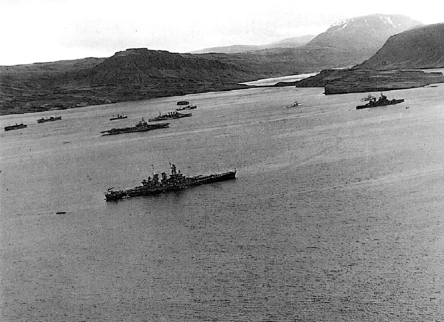 2.00k | The covering forces of the PQ-17 Convoy (British and American ships) at anchor in the harbor at Hvalfjord, Iceland, May-June 1942. Washington (BB-56) in foreground loading supplies with HMS Norfolk in the rear. Wichita (CA-45) is in the middle. | USN photo # 80-G-24826 from the National Museum of the U.S. Navy, courtesy of flickr.com. | |