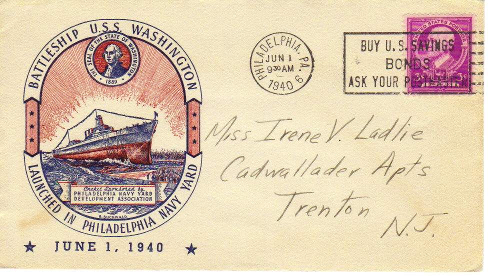 126k | Commemorative postal cover marking the launching of the Washington (BB-56), 1 June 1940. | USN photo courtesy of Robert M. Cieri. | |