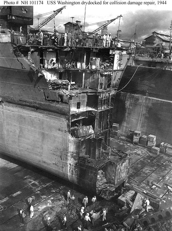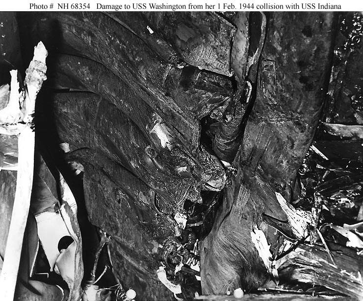 106k | Washington (BB-56) damage received in her 1 February 1944 collision with Indiana (BB-58). | U.S. Naval Historical Center Photograph # NH 68354. | |