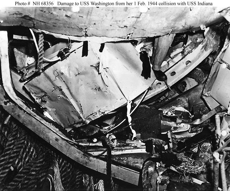 42k | The bow of the Washington (BB-56) after the collision with the Indiana (BB-58). The picture was taken at Majuro Lagoon on 2 February 1944. Only the anchor chains prevented the main deck from totally collapsing. | Naval History and Heritage Command # NH 68355. Contributed by Joseph M. Radigan (of blessed memory). | |