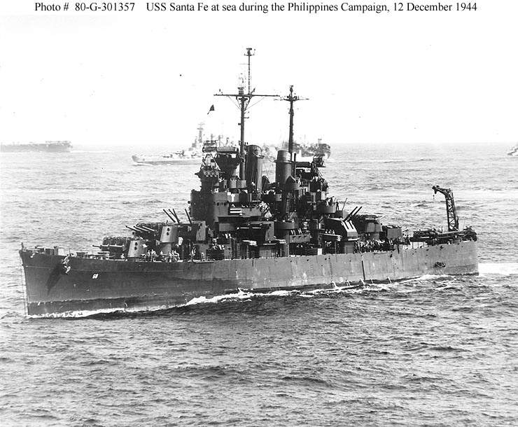 78k | The light cruiser Santa Fe (CL-60) at sea during the Philippines campaign, 12 December 1944. Washington (BB-56) is alongside an oiler in the center background. Photographed from Essex (CV-9). | Official USN photo # 80-G-301357, now in the collections of the National Archives. | |