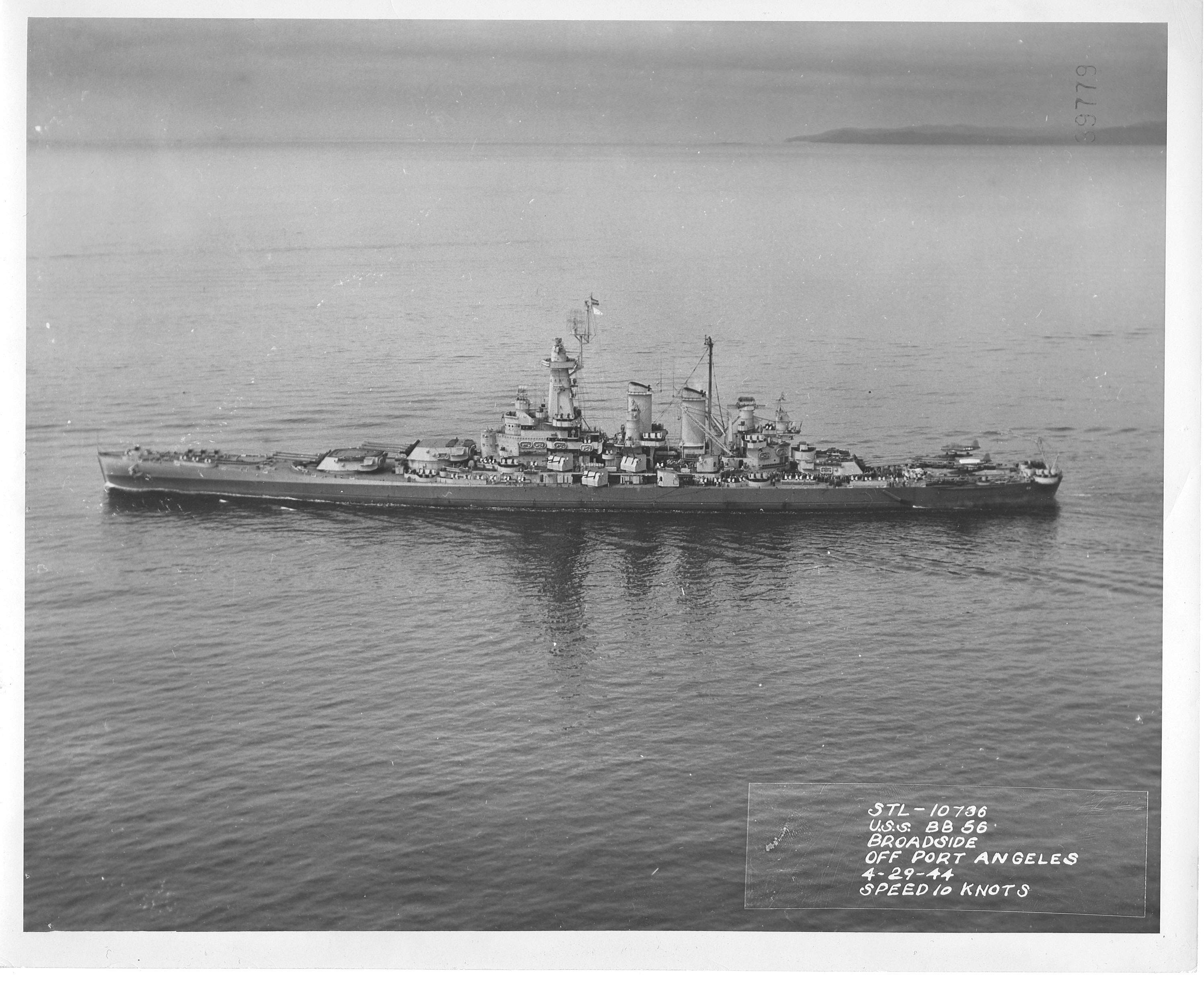 415k | By the bay (possibly at Noumea), Washington (BB-56) & and an APA, possibly the Hunter Liggett (APA-14). One of the old 535-foot transports (built during the WWI program for general passenger liner use). Several of these became USN APA's in WWII. Washington departed Noumea on 30 April 1943, bound for the Hawaiian Islands. While en route, TF 16 joined up; and, together, the ships reached Pearl Harbor on 8 May. Washington, as a unit of, and as flagship for, TF 60, carried out battle practice in Hawaiian waters until 28 May 1943, after which time she put into the Pearl Harbor Navy Yard for overhaul. The photo has a caption on the back that says; " late 1943; off Solomon Islands." I don't think that this caption is true, as the MS22 hull camouflage scheme paint line is well below her anchor. This dates the photo to after April, 1944, as the Washington was so repainted when being repaired from her collision with the Indiana (BB-58). |