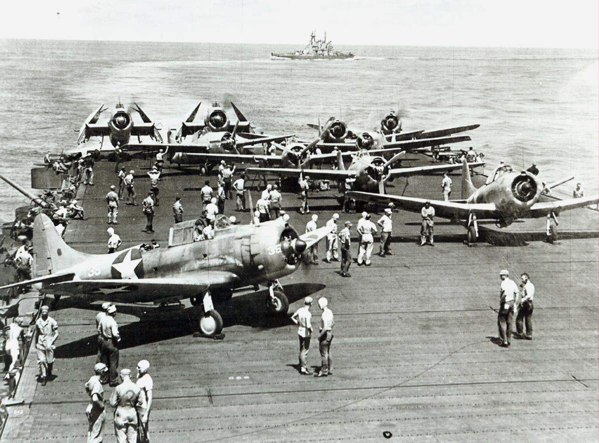 1.69k | Two U.S. Navy Curtiss SB2C-4 Helldiver dive bombers of Bombing Squadron 83 (VB-83) fly against the backdrop of ships of Task Group 38.3 operating off Okinawa. VB-83 operated from Essex (CV-9), pictured in foreground, during the period March-September 1945. Note the geometric identification symbols ("G-symbols") of the aircraft from the Essex. In the background are the battleship Washington (BB-56), a long-hull Essex-class carrier and an Independence-class light carrier. | Photo courtesy of US Navy and Marine Corps Museum/Naval Aviation Museum, Photo No. 1996.253.360 via Robert Hurst. | |