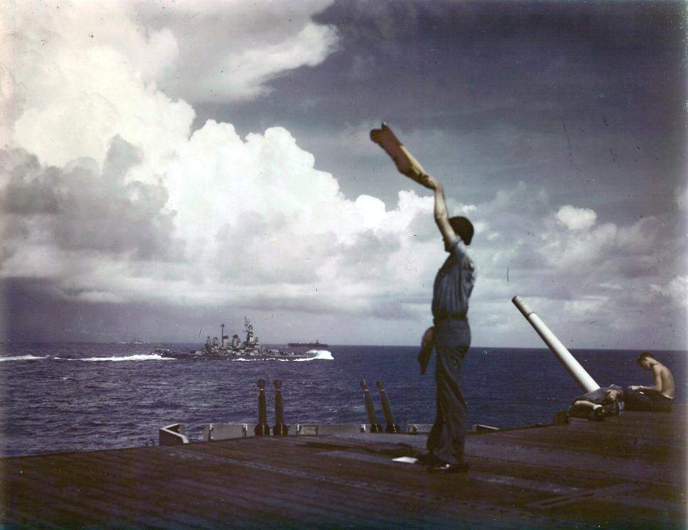 570k | TG 38.3 beginning to reform a column formation after making a simultaneous turn to port. The ships are entering Ulithi Anchorage on 12 December 1944 after strikes against the Japanese in the Philippines. Ships visible in this photo are: Langley (CVL-27); Ticonderoga (CV-14); Washington (BB-56); North Carolina (BB-55); South Dakota (BB-57); Santa Fe (CL-60); Biloxi (CL-80); Mobile (CL-63) and Oakland (CL-95). | None of these can be 12 December. These ships (TG 38.3) departed Ulithi on 11 December. This TG entered Ulithi together on 2 and 24 December. These are likely 24 December 1944 when they're conducting numerous maneuvers and firing exercises while entering Ulithi. Slight chance 2 December but if Oakland (CL-95) is in the picture, she didn't enter with the others on 2 December. One thing for certain, these are not the 11th like the caption on NHHC states. Many open discussions on forums discussing the merits of both dates. Text & ID courtesy of Richard Averitt. USN photo courtesy of Pieter Bakels. |