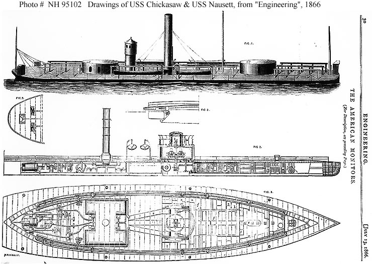 118k | "The American Monitors". Engraving published in the English magazine "Engineering", 13 July 1866, page 30. Figure 1 is a depiction of Chickasaw Figures 2 & 3 are inboard profile and interior deck plans of the light draft monitor Nausett. The original magazine is held by the Navy Department Library. | U.S. Naval Historical Center Photograph # NH 95102. | |