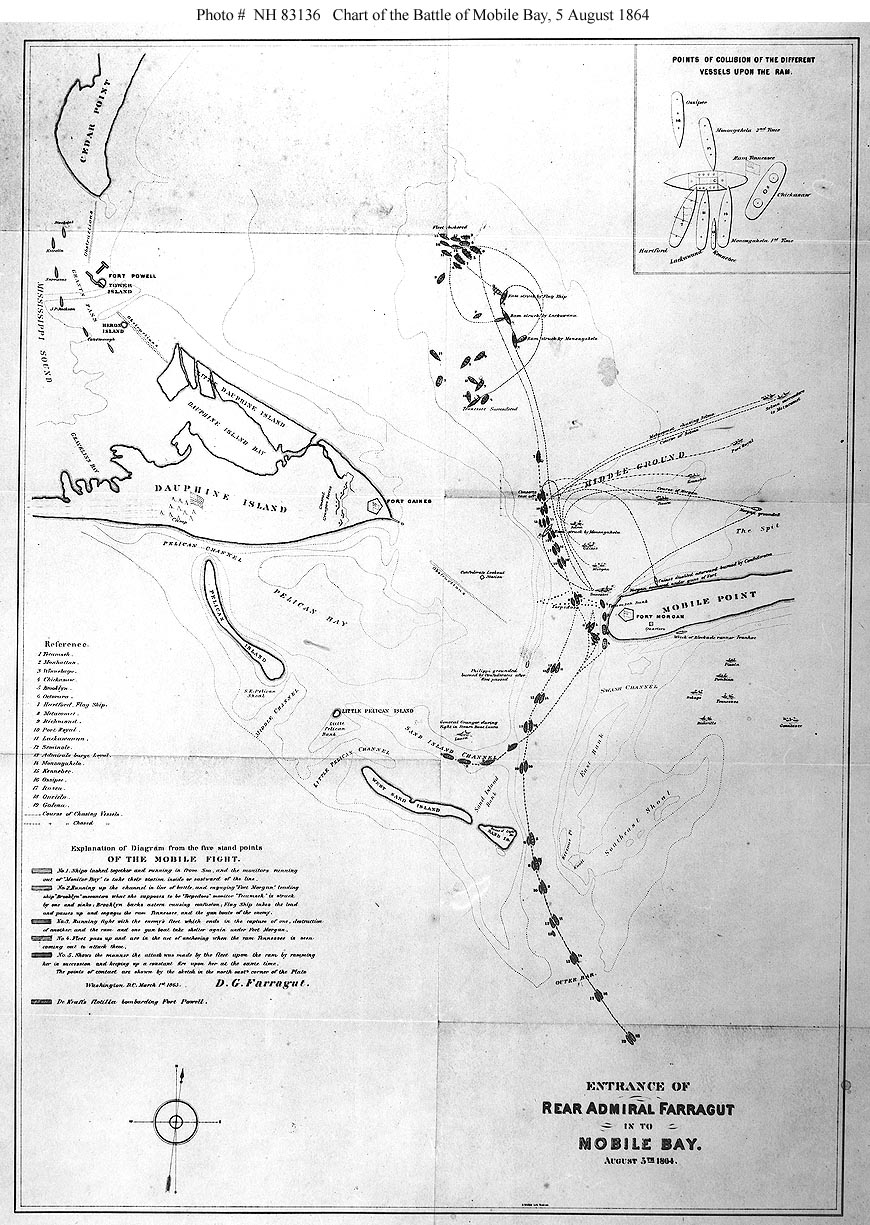 277k | "Entrance of Rear Admiral Farragut in to Mobile Bay. August 5th 1864" Chart of the action, prepared by RAdm. D.G. Farragut, Washington, D.C., March 1st, 1865. "Explanation of Diagram from the five stand points of the Mobile fight." (printed in the lower left): "No.1. Ships lashed together and running in from Sea, and the monitors running out of "Monitor Bay" to take their station inside or eastward of the line." "No.2. Running up the channel in line of battle, and engaging 'Fort Morgan' leading ship Brooklyn encounters what she supposes to be 'torpedoes' monitor 'Tecumseh' is struck by one and sinks; Brooklyn backs astern causing confusion; Flag Ship takes the lead and passes up and engages the ram Tennessee and the gun boats of the enemy." "No.3. Running fight with the enemy's fleet which ends in the capture of one, destruction of another, and the ram and one gun boat take shelter again under Fort Morgan." "No.4. Fleet passes up and are in the act of anchoring when the ram Tennessee is seen coming out to attack them" "No.5. Shows the manner the attack was made by the fleet upon the ram by ramming her in succession and keeping up a constant fire upon her at the same time." "The points of contact are shown by the sketch in the north east corner of the plate." "De Kraft's flotilla bombarding Fort Powell." (in upper left of the chart). Ships are (as numbered in "Reference" list at left): 1. Tecumseh; 2. Manhattan; 3. Winnebago; 4. Chickasaw; 5. Brooklyn; 6. Octorara; 7. Hartford, Flag Ship; 8. Metacomet; 9. Richmond; 10. Port Royal; 11. Lackawanna; 12. Seminole; 13. Admiral's barge Loyal; 14. Monongahela; 15. Kennebec; 16. Ossipee; 17. Itaska; 18. Oneida; 19. Galena. | Courtesy of the Naval Historical Foundation. U.S. Naval Historical Center Photograph. USNHC # NH 83136. | |