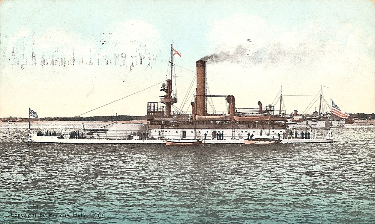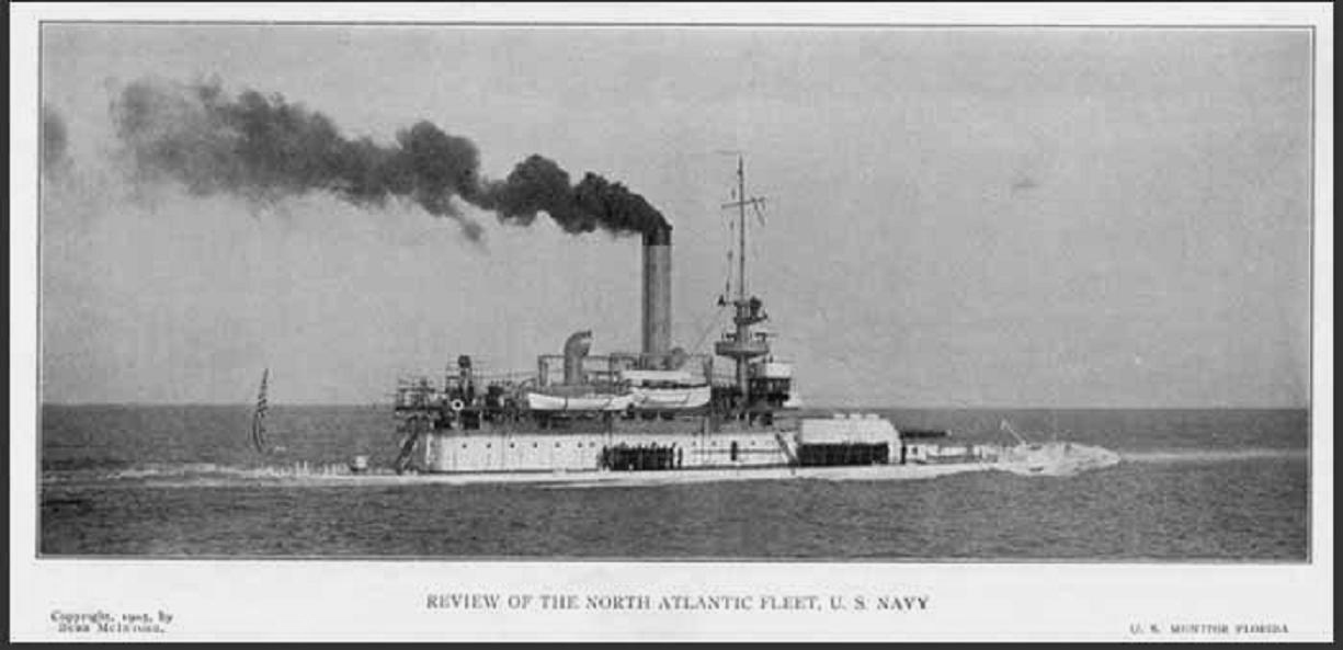 72k | Florida (M-9) photographed by Robert Enrique Muller in 1904, while serving with the Coast Squadron trained midshipmen on summer cruises, and operated along the east coast and in the Caribbean waters. | Photo courtesy of greatwhitefleet.info, by William Stewart. Text courtesy of DANFS. |