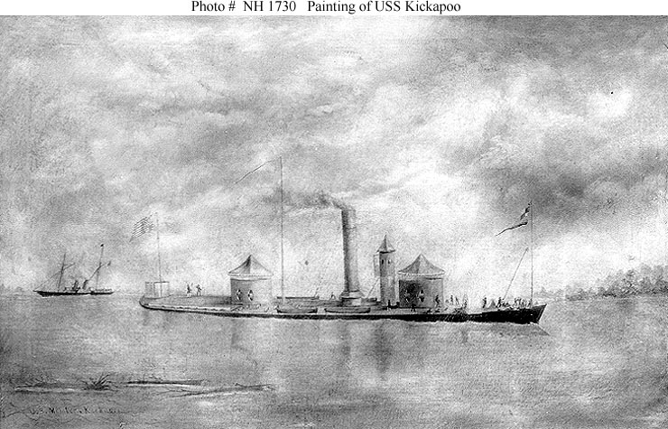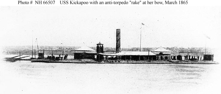 Halftone reproduction of a photograph taken in the Mobile Bay area, Alabama, in March 1865, showing the Kickapoo with an anti-mine "torpedo rake" mounted over her bow.