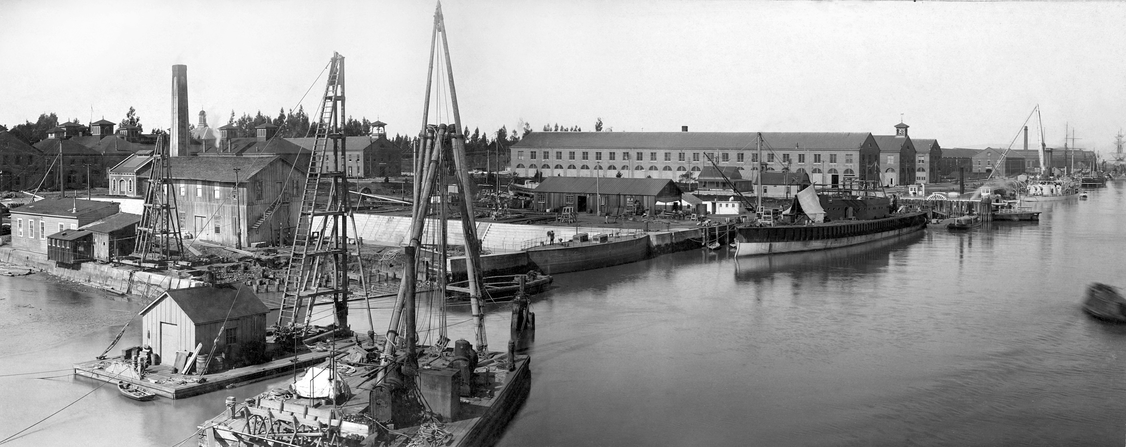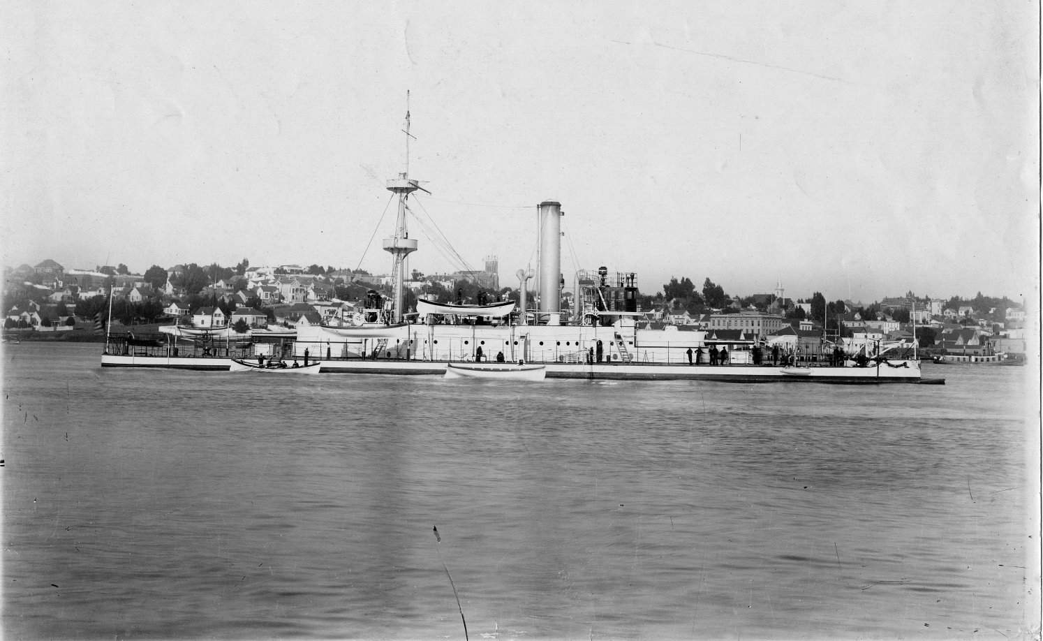 ![]() | 575k | Monadnock (BM-3) and Camanche aft of her in the Mare Island channel on 20 June 1898. To the far left, just visible, are the earthquake damaged east ends of building 85 and 91. The earthquake hit on 30 March 1898. | Photo from the files of the Vallejo Naval & Historical Museum courtesy of Darryl L. Baker. | |