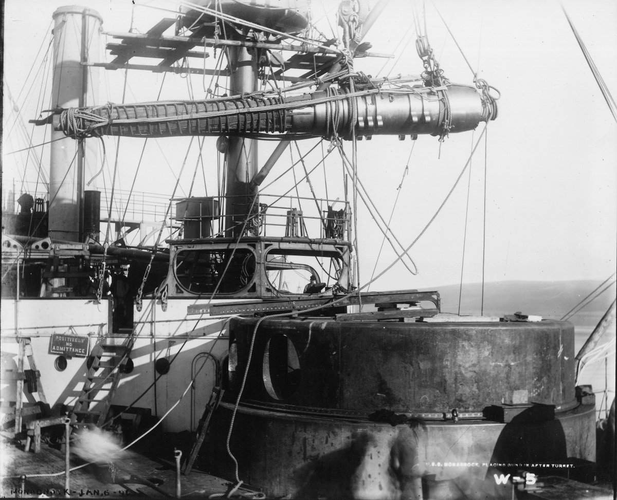 ![]() | 121k | The first of Monadnock's (BM-3) forward 10" guns is being installed in January 1896 at Mare Island Navy Yard. | USN photo courtesy of Darryl L. Baker. Text i.d. courtesy of John Hendershot. | |