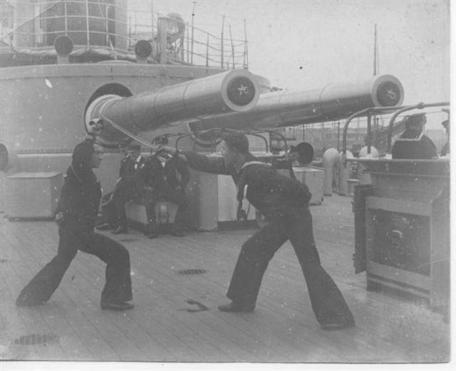![]() | 51K | Hand to hand practice with swords in front of the main 2 dual 10" turret of the Monadnock (BM-3), circa 1900 - 1904. | USNHC photo from the collection of George Henry Snow, courtesy of Mark Kozak. | |