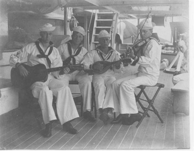 ![]() | 57K | "Dueling Strings" for a foursome aboard the Monadnock (BM-3), circa 1900 - 1904. | USNHC photo from the collection of George Henry Snow, courtesy of Mark Kozak. | |