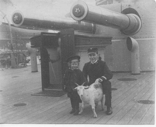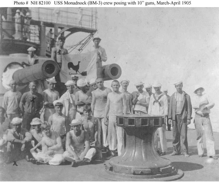 ![]() | 53K | Monadnock's (BM-3) mascot & friends pose in front of the main 2 dual 10" turret, circa 1900 - 1904. | USNHC photo from the collection of George Henry Snow, courtesy of Mark Kozak. | |