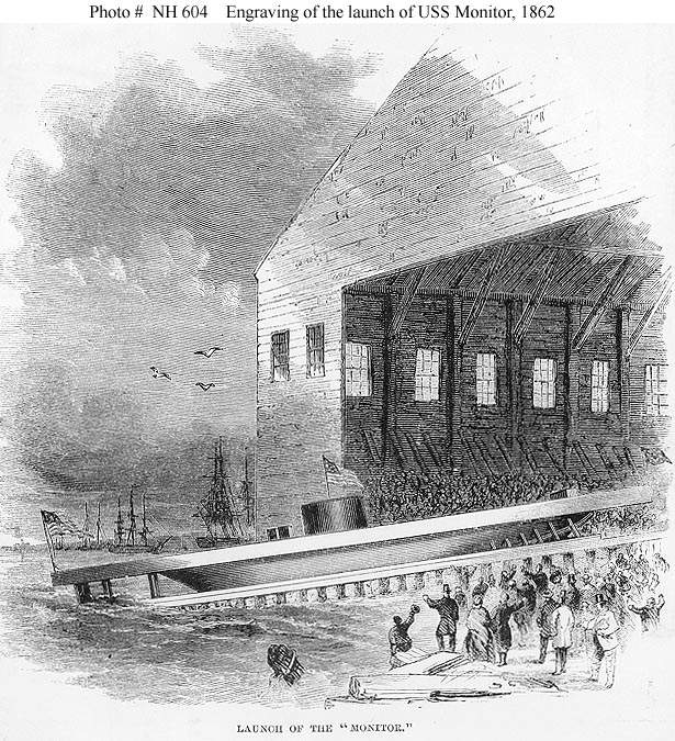 118k | Line engraving published of the Monitor in Harper's Weekly, September 1862, page 433, depicting the launching of the ship at the Continental Iron Works, Greenpoint, New York, on 30 January 1862. It seems unlikely that Monitor was launched with her heavy armored turret, pilothouse and other fittings already installed. | U.S. Naval Historical Center Photograph. USNHC # NH 604. | |||||||||||||||||||||||||||||||||||||||||||||||||||||||||||||||||||||||||||||||||||||||||||||||||||||||||||||||||||||||||||||||||||||||||||||
