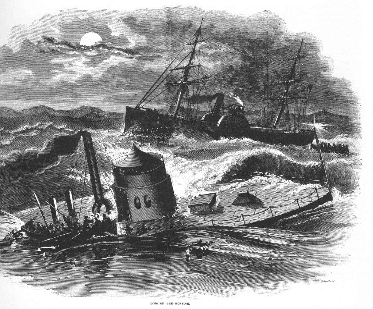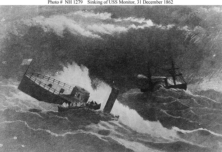 219k | Loss of the Monitor Depicting Monitor sinking in a storm off Cape Hatteras on the night of 30-31 December 1862. A boat is taking off crewmen, and Rhode Island is in the background. |